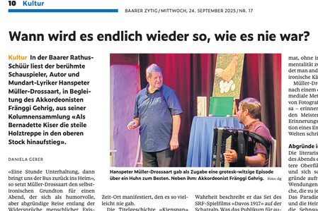 "Anschließend trug Müller-Drossaart mit seiner zurückhaltenden, aber ungemein präzisen Gestik und Mimik nebst der bereits erwähnten Geschichte vom Bischof auf dem Pilatus die Erzählungen 'Mettler' und 'Flügge' vor."